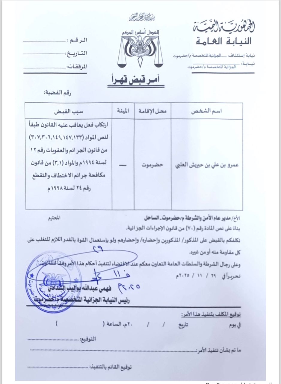 أصدرت النيابة الجزائية المتخصصة بمحافظة حضرموت أوامر قبض قهرية بحق عمرو بن علي بن حبريش العلي ومبارك أحمد بن بكر العوبثاني، على خلفية استهداف المنشآت النفطية وارتكاب جرائم الاختطاف والتقطع.